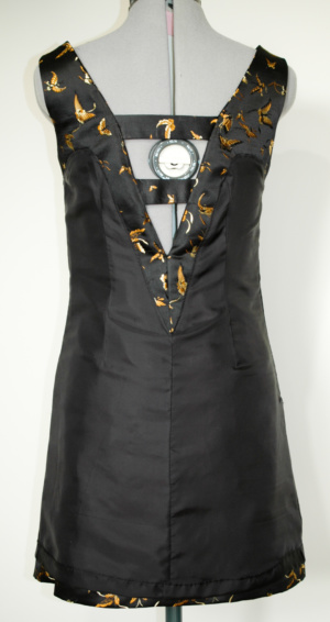 Next step, fabric. I wanted fabric that would hold it’s shape and not be clingy but would also be soft and have some sparkle or other festive element. It took me quite a while to find what I was looking for… until I saw 50% Chinese brocades at Gala Fabrics. I chose a silk and rayon brocade with gold butterflies on a black base. I briefly considered the impracticality of owning a garment made out of silk brocade but then I thought, how often do I get to fly to San Francisco just for a Christmas party? Not the most logical of arguments but it was 50% off and I went for it.